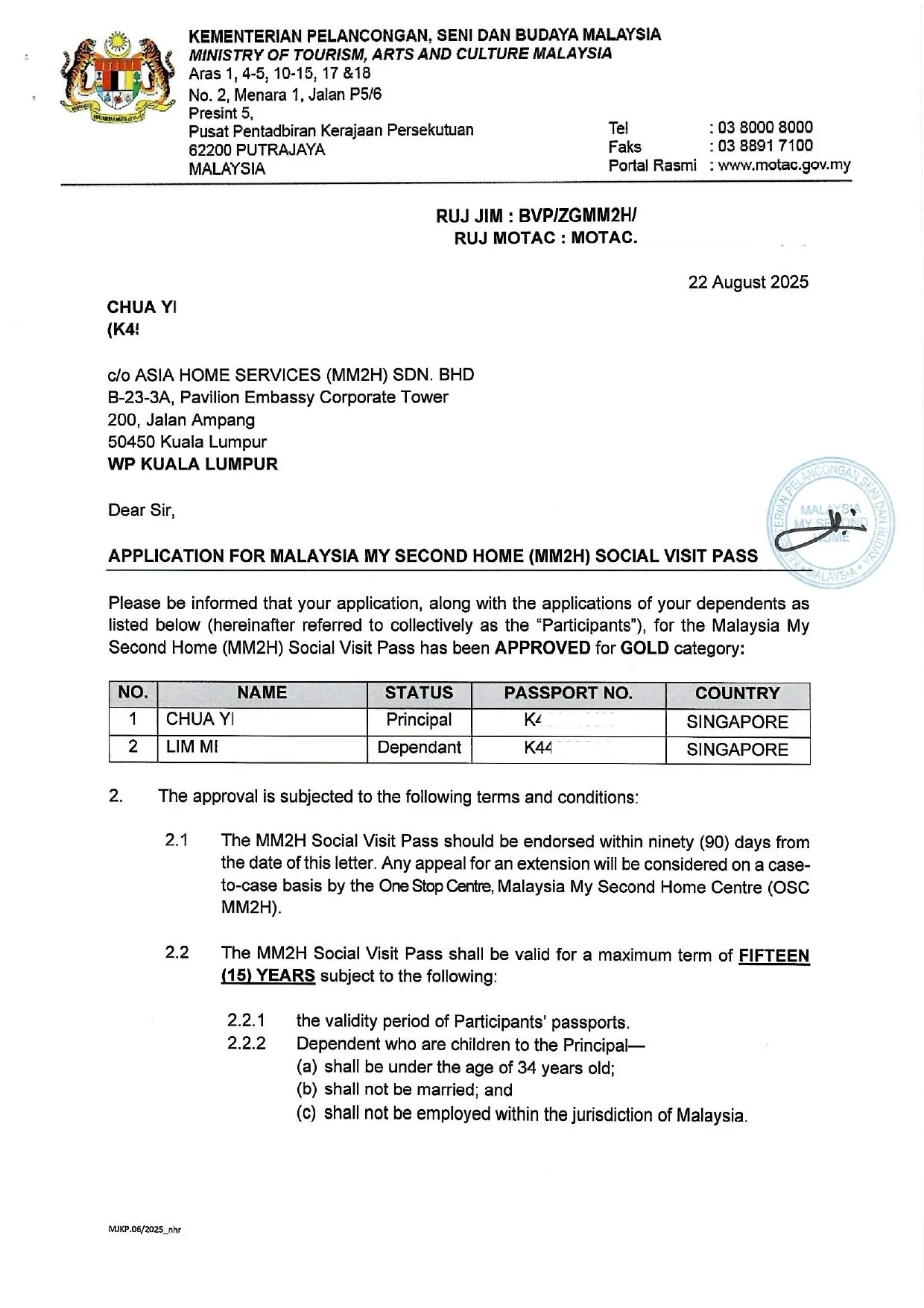 Sample MM2H Approval Letter for Gold Category (for Singaporean applicants )